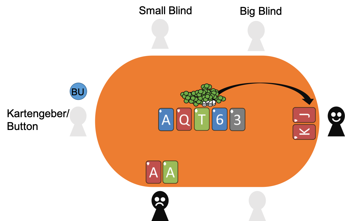 In den meisten Pokervarianten gewinnt am Showdown die beste Kombination aus den 5 Karten, welche dir gemäß der Regeln der jeweiligen Variante zur Verfügung stehen. Dies können sowohl Karten sein, die nur dir gehören (im Texas Hold’em Poker typischerweise deine Hole Cards) als auch Karten die von allen Spielern verwendet werden können (im Texas Hold’em Poker typischerweise die Board Cards).