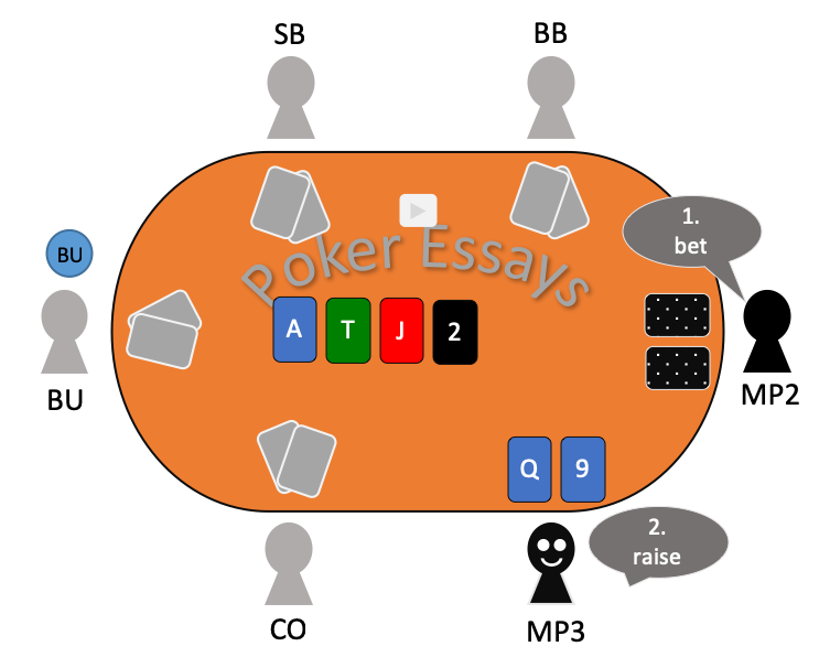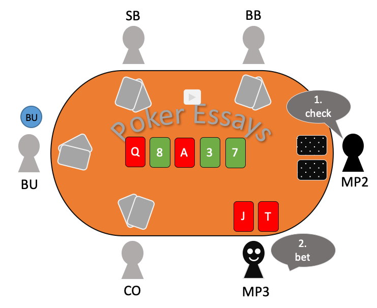 In der gegebenen Situation checkt MP2 am River. MP3 hält J♥ T♥ und hat sowohl seine Straightdraws als auch den Flushdraw verfehlt. MP3 geht davon aus, dass er geschlagen ist, setzt aber dennoch den Bluff, da MP2 Schwäche gezeigt hat.