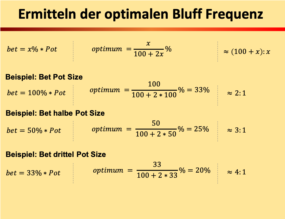 Nimm an, es befinden sich 100bb im Pot und du setzt halbe Pot Size, also 50bb. Wenn du in dieser Situation nur deine starken Hände bettest, könnte dein Gegner mit seinen mittelstarken Händen (Bluff Catcher) jedes mal aufgeben und nur seine starken Hände weiterspielen. Entsprechend solltest du in dieser Situation hinreichend viele Bluffs einbauen, dass dein Gegner nicht mehr beruhigt folden kann, aber wenige genug, dass er auch nicht einfach jedes mal callen kann. Der Weg zur optimalen Bluff Frequenz führt über den Erwartungswert des Gegners. In der gegebenen Situation müsste er 50bb callen um 150bb aus dem Pot zu gewinnen. Das bedeutet, er könnte sich drei erfolglose Calls leisten, wenn er beim vierten mal die 150bb aus dem Pot gewinnt. Entsprechend wäre deine optimale Bluff Frequenz bei einer Bet in Höhe halbe Pot Size 3:1. Das heisst auf drei starke Hände in deiner Range solltest du eine Bluff Hand haben.