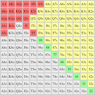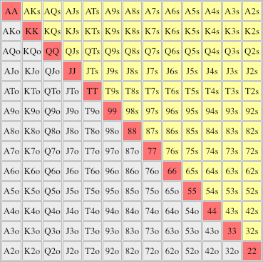 Die dargestellte Range beinhaltet in Summe die Menge aller möglichen Pocket Pairs. Das sind bei 13 Kartenwert (2, 3, 4 , 5, 6, 7, 8, 9, T, J, Q, K, A) mit je sechs möglichen Kombinationen zum Paar insgesamt 78 verschiedene Hände. Nämlich