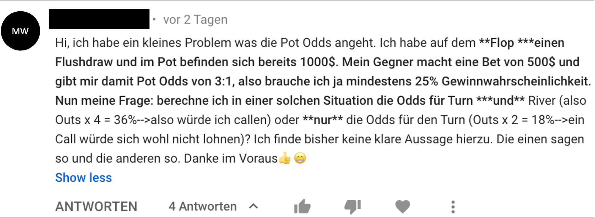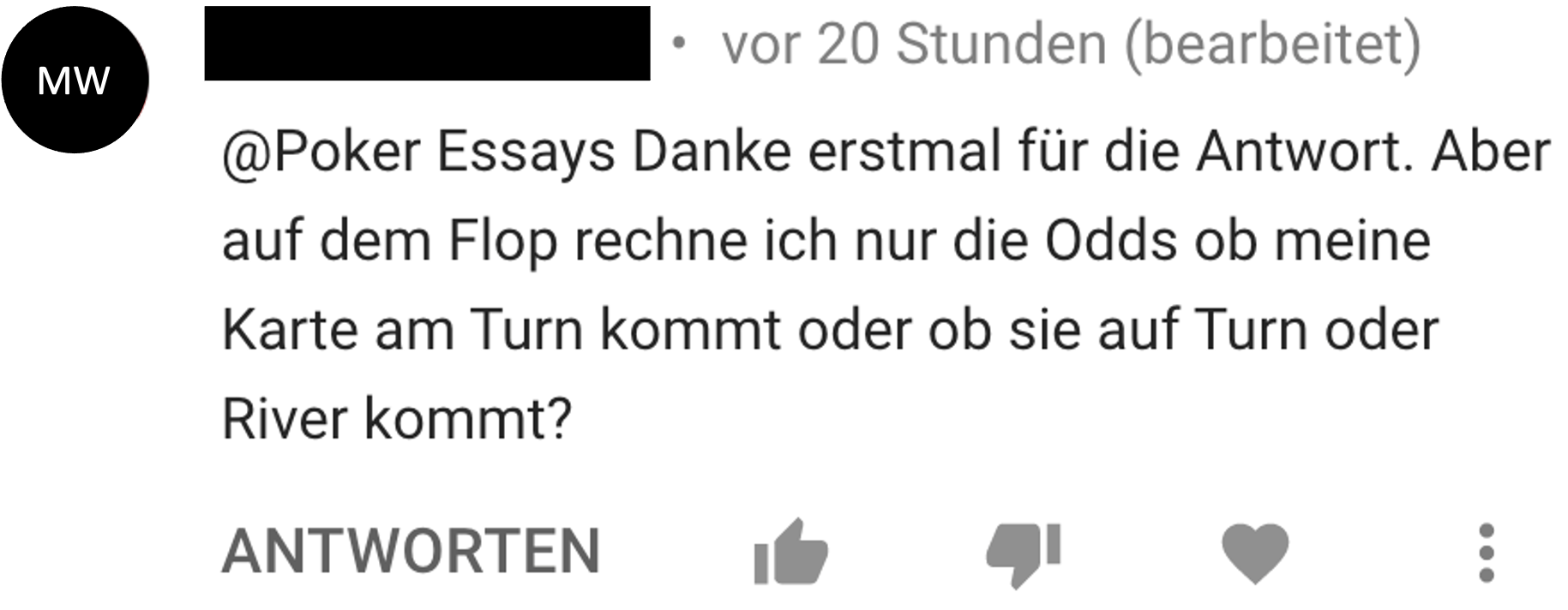 Diese Frage ist berechtigt, da es einen Unterschied macht, ob nur eine weitere Karte (am Turn) in die Odds einfließt oder zwei weitere Karten (Turn und River).