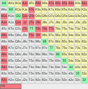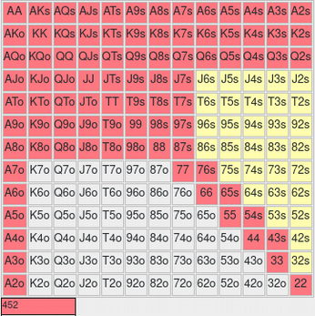 Mit diesen Vorbereitung kannst du versuchen den Gameplan des Button für das Spiel ab dem Turn zu formulieren. Da du für das Spiel preflop und am Flop die entsprechenden Vorgaben nutzt startest du, indem du verinnerlichst, mit welcher Range der BU den Turn erreicht. Die Hände, die der BU gemäß Starting Hand Chart preflop erhöht siehst du hier dargestellt.