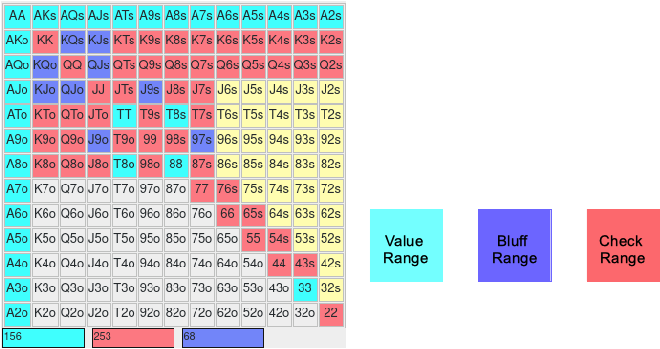 Abschließend prüfst du noch einmal das Verhältnis aus Value Hands zu Bluff Hands. Im aktuellen Status des Gameplan entspricht dieses in etwa einer Bluff Frequenz von 26%. Bei Odds von 5:2 würdest du eine Frequenz von 2/7 also etwas mehr als 28% erwarten – an dieser Stelle ließe sich gegen sehr gute Gegner z.B. durch Anpassen der Bet Size nachschleifen, auf den unteren Limits – wo die Gegner tendenziell call-freudiger sind ist dieser Wert aber Ok – gegen die call/freudigsten Gegenspieler sollte er sogar nach unten angepasst werden da die Bluffs zu selten zum erfolg führen. Dies kann auch durch anpassen der BetSize oder verschieben von Bluff Händen in die Check Range geschehen.