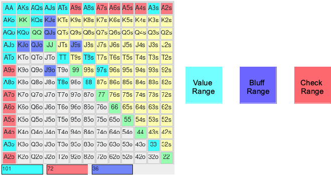 Wenn du am River die Kombinationen mit dem J♥ als River Card aus der BU Range abziehst, so kannst du davon ausgehen, dass der BU den River mit 209 Händen erreicht. Unterstellst du wieder 2/3 Pot Size als Standard Bet Size, verwendest die stärksten Hände zum füllen der Value Range, die schwächsten Hände zum füllen der Bluff Range und die mittleren Hände zum füllen der Check-Behind Range so ist in etwa die hier dargestellte Rangeverteilung für den Gameplan am River plausibel.