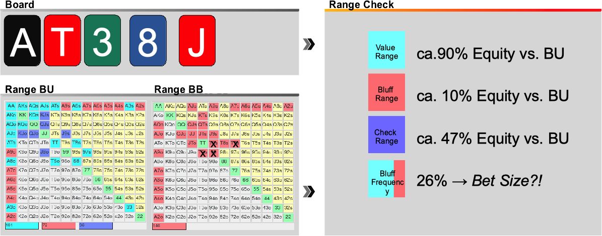 In der gegebenen Situation, in der der BB auf die Bet des BU am flop nur gecalled hat wäre die hier dargestellte Verteilung als Startpunkt plausibel.Je nachdem wie stark du deine Gegner einschätzt und ob dein Entwurf des Gamplans ein ausgewogenes Verhältnis aus Bets und Checks hergibt, möchtest du die Check Range noch etwas stärken, in dem du im richtigen Verhältnis Hände aus der Value und Bluff Range in die Check Range umverteilst. Stellst du hingegen fest, dass du zu wenig Value Hands in deiner Range hast, sollte dies ein Warnsignal sein, dass irgendetwas im Gamplan Design auf den vorherigen Streets schief gelaufen ist. Für den Start lass mich jedoch mit der hier dargestellten Range fortfahren und analysiere später selbst, welche Auswirkungen eine Stärkung der Check Range hat.