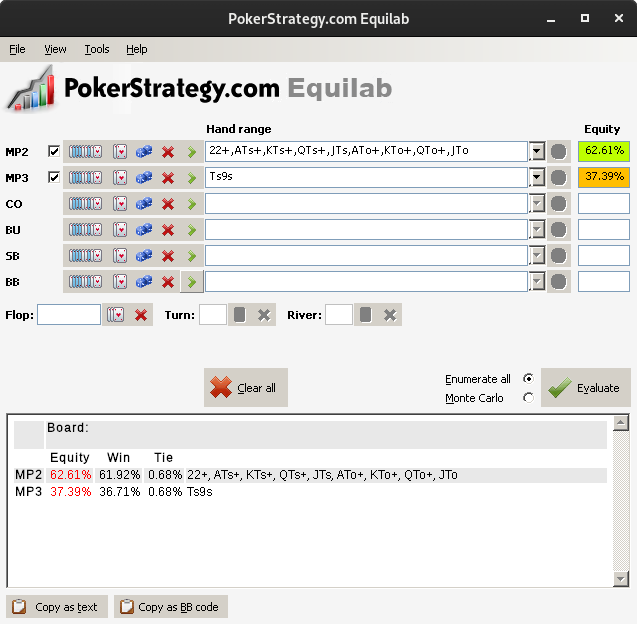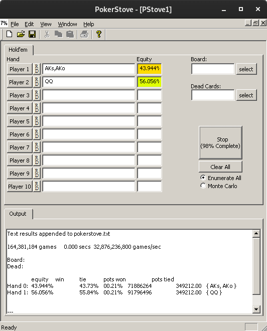 Die Equity einer Hand lässt sich manuell bestimmen, für das praktische Spiel hat es sich jedoch bewährt, Software zu verwenden die auf Equityberechnung spezialisiert ist. Zwei sehr gute Lösungen sind kostenlos bzw. sogar als Open Source verfügbar. In ihrer Funktion als Equity Kalkulatoren liefern beide Tools identische Ergebnisse, welches Tool du benutzt, entscheidest du am besten durch ausprobieren.