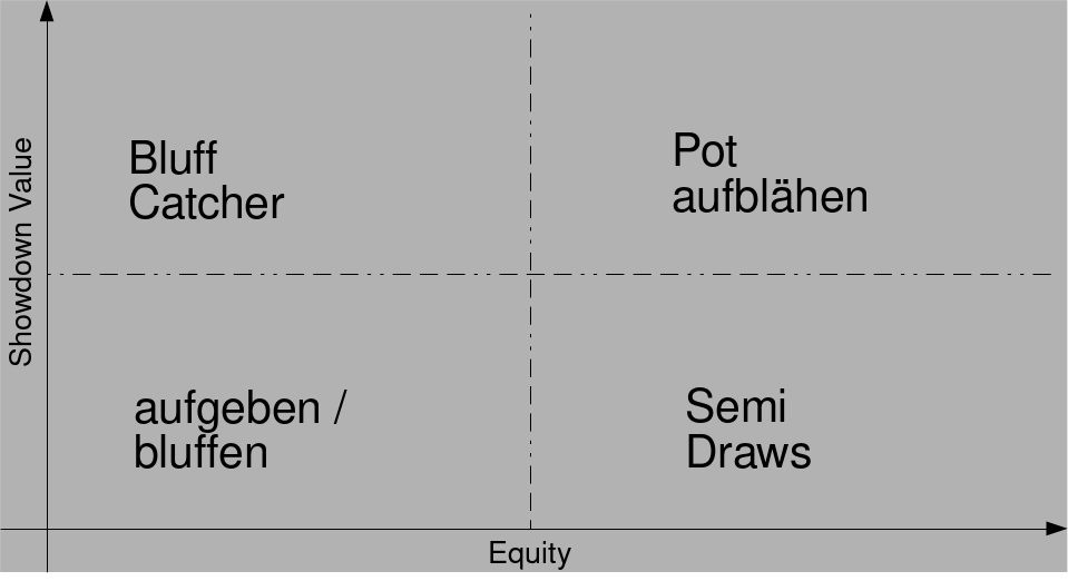 Für das Design deines Gameplan bedeutet dies, dass du Hände aus allen vier Kategorien in deiner Range haben möchtest. Denn während auf den unteren Limits deine Mitspieler vermutlich gar nicht bemerken werden wenn du nur starke Hände mit viel Showdown Value und massig Equity gepaart mit eine paar starken Draws spielst, wirst du gegen stärkere Gegner das Problem bekommen, dass sie dich nicht mehr ausbezahlen wenn klar ist, dass du nur starke Hände hältst. Wie genau du einen Gameplan entwirfst, geht über den Rahmen dieses Kapitels hinaus, ich empfehle dir jedoch möglichst frühzeitig deine eigenen Ranges auf Ausgewogenheit bzgl. der Equity-Gruppen hin zu überprüfen.