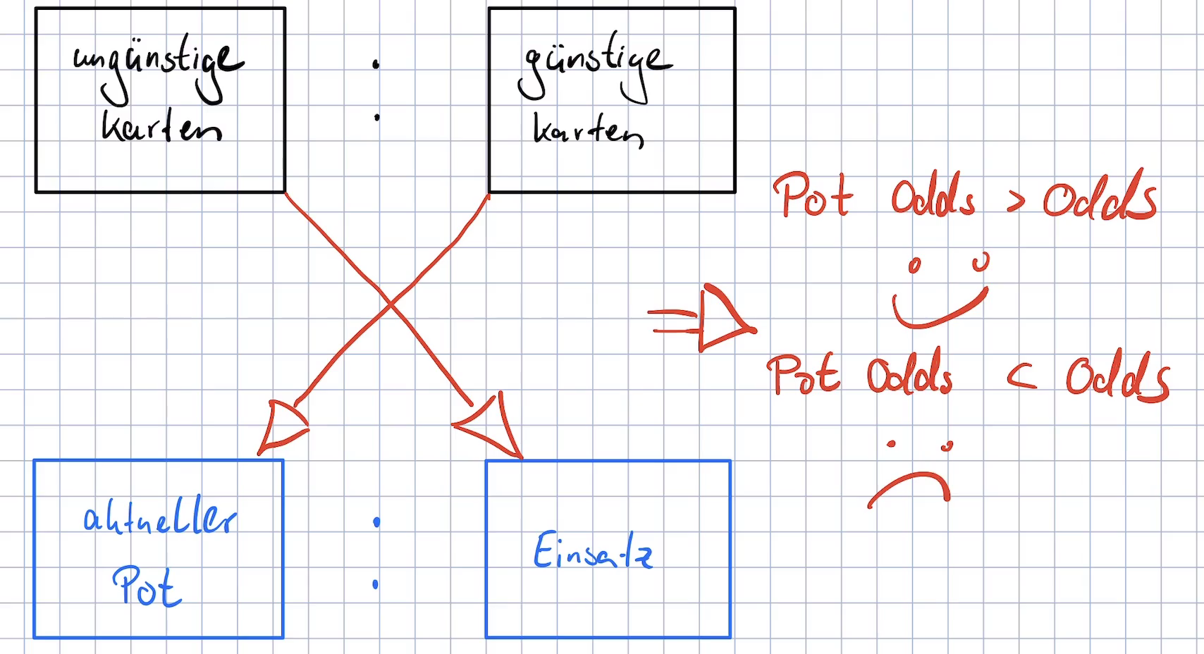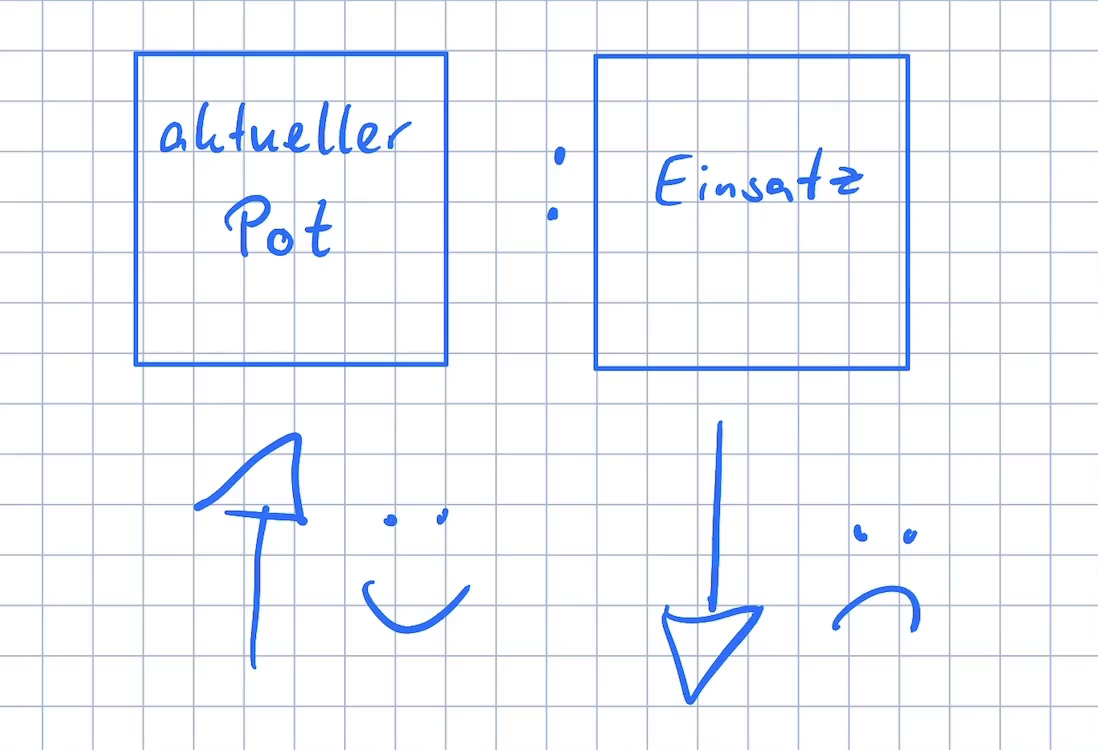 Genau aus diesem Zusammenhang folgt die oft zitierte Regel, dass du dich in einer vorteilhaften Situation befindest, wenn deine Pot Odds größer sind als deine Odds. Und dass du dich in einer unvorteilhaften Situation befindest wenn deine Pot Odds kleiner sind als deine Odds.