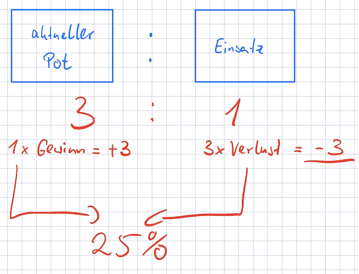 Oder anders ausgedrückt – im Mittel möchtest du bei Pot Odds von 3:1 jedes 4 mal den Pot gewinnen um ± 0 zu spielen was unter den eben beschriebenen vereinfachenden Annahmen einer benötigten Equity von 25% entspricht.